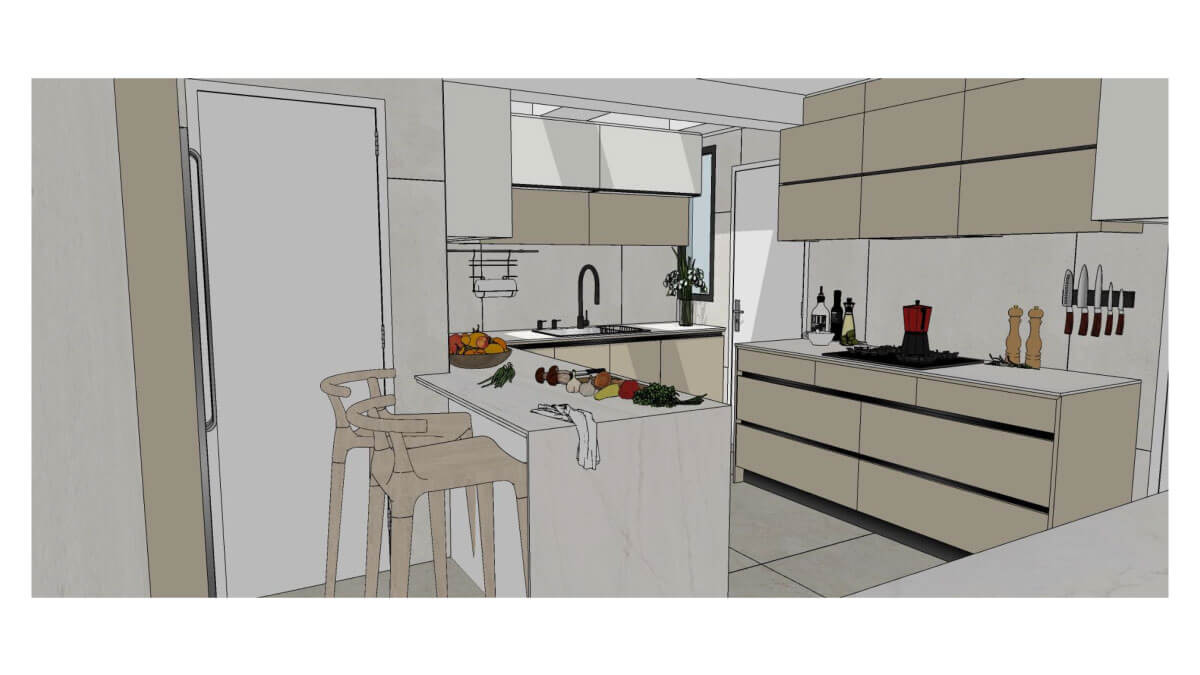 Este también es considerado un lugar de encuentro, donde cocinar no es solo una actividad más dentro del día, es una instancia de reunión familiar y social. Es por eso que nuestro diseño apuntó a crear un espacio que equilibra funcionalidad y estética, priorizando la fluidez de movimiento y la flexibilidad para adaptarse a diferentes momentos, desde una reunión con amigos, comida familiar, o las comidas del día a día.
